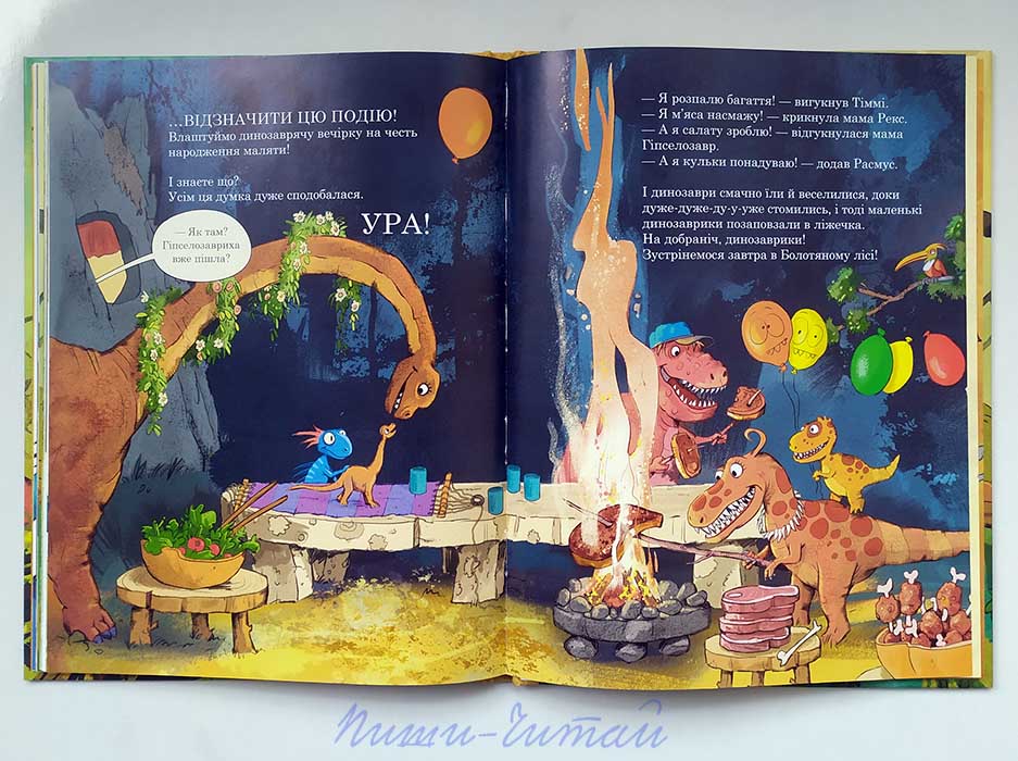 Одного разу рано-вранці Расмуса Рекса рішуче розбудив його друг Тіммі Троодон. У Тіммі радісна новина: ось-ось проклюнеться яйце його мами, і в нього буде братик! Ну як можна пропустити таку подію?! Але поки Расмус швиденько збирається, бабуся Рекс проковтнула його друга Тіммі. Расмус рішуче наполягає, щоб бабуся повернула друзяку назад, і бабуся із вибаченням повернула Тіммі онуку. Тато Рекс, дізнавшись, що друзі збираються до Тіммі, попереджає їх, щоб вони не йшли через Болотяний ліс, тому що там сьогодні бачили велику і страшну потвору. Ну а якщо батьки щось забороняють, то дітям неодмінно треба зробити саме так! Тим більше, що шлях через темний і грузький ліс був набагато коротшим. В лісі небезпека чатувала всюди: крім самого болота й хащей, друзів могли налякати динозаври, які плавали, літали й сиділи в засідках. Так і вийшло, що спочатку їх налякала Еббі Анкілозавр, потім - Мері Мікрораптор, і нарешті вони зустріли маму Рекс, яка і вирішила провести друзяк до Тіммі. Вони прийшла як раз перед тим, як з яйця почало вилуплюватися дитинча. І яке ж було здивування, коли з яйця вилупився маленький гіпселозавр!.. Чим же закінчиться ця історія? Звідки взагалі у мами Троодон з’явилось яйце гіпселозавра? Чи швидко знайдеться мама новонародженого? І хто та страшна величезна потвора, яку бачили у Болотяному лісі? Чи потоваришують матусі Гіпселозавр і Троодон? Чи будуть динозаври святкувати народження маляти?.. Про все це ви неодмінно дізнаєтесь, дочитавши книгу до кінця. Книга українською мовою, тверда палітурка, великий формат, повністю кольорове видання, ілюстрації. Книги серії рекомендовано для дітей дошкільного і молодшого шкільного віку як для читання дорослими дітям, так і для першого самостійного читання. Докладно про всю серію книг «Друзяки-динозаврики» читайте, будь ласка, у нашому огляді на Головній сторінці сайту у розділі Огляди книжок. Рекомендуємо серію книг «Друзяки-динозаврики» як пізнавальне, розважальне, виховне читання. Занурюйтесь у світ пригод разом з дітьми, прищеплюйте дітям любов до книжок і читання! З 16.01 по 31.01 купуйте книжки за акційною ціною: 1книга – 225.00грн, 2книги – 450.00грн, 3книги – 660.00грн, 4книги – 880.00грн, 5книг – 1075.00грн, 6книг – 1275.00грн, 7книг (повний комплект) – 1400.00грн