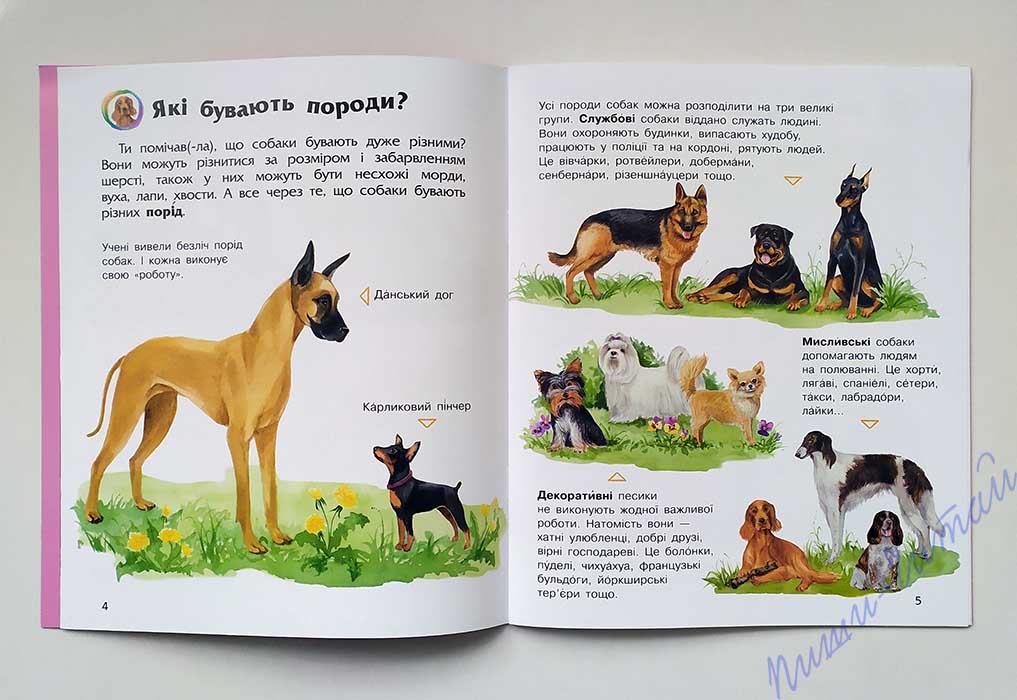 Якщо Вашому малюку виповнилося 2 роки, Ви можете познайомити його із такими книгами, як енциклопедії. На вас чекають короткі і зрозумілі тексти, великі яскраві ілюстрації, кумедні віршики, завдання. Розглядайте разом із дитиною картинки, читайте цікаві тексти про те, як людина приручила собаку і які бувають породи собак, як собаки вправно допомагають людям знаходити злочинців і охороняти територію і будівлі, рятувати людей у надзвичайних ситуаціях, пересуватися незрячим і одужувати хворим, охороняти стадо від хижаків і злодіїв, полювати, перевозити людей і вантаж в умовах снігової Півночі, а також допомагають вченим у їхніх дослідженнях, беруть участь у спортивних змаганнях і виставках, і взагалі вміють бути добрим і відданим другом у повсякденному житті дітей і дорослих. Впевнені, ця книжка сподобається Вашому малюку, вона стане початком захопливої подорожі у світ знань. Обкладинка книги – тонкий картон (м’яка), книга українською мовою.