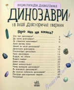 Если Вашему ребенку уже исполнилось 2года, Вы можете познакомить его с такими книгами, как энциклопедии. Вас ждут короткие тексты, большие яркие иллюстрации, понятные малышу, смешные стишки. Рассматривайте вместе с ребенком картинки, читайте интересные тексты о том, кто такие динозавры, как появились, где жили и чем питались, какие из них были хищниками, какие летали, а какие плавали, какие еще животные населяли нашу планету в доисторические времена и как ученые узнали обо всем этом. Уверены, что эта книжечка понравится Вашему малышу, она станет интересным началом путешествия в мир знаний. Обложка книги - тонкий картон (мягкая), язык - украинский, на русском языке - под заказ.