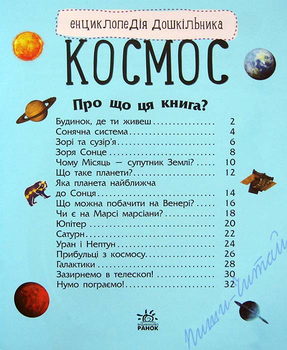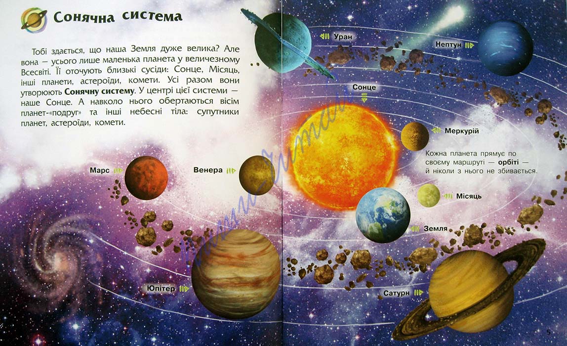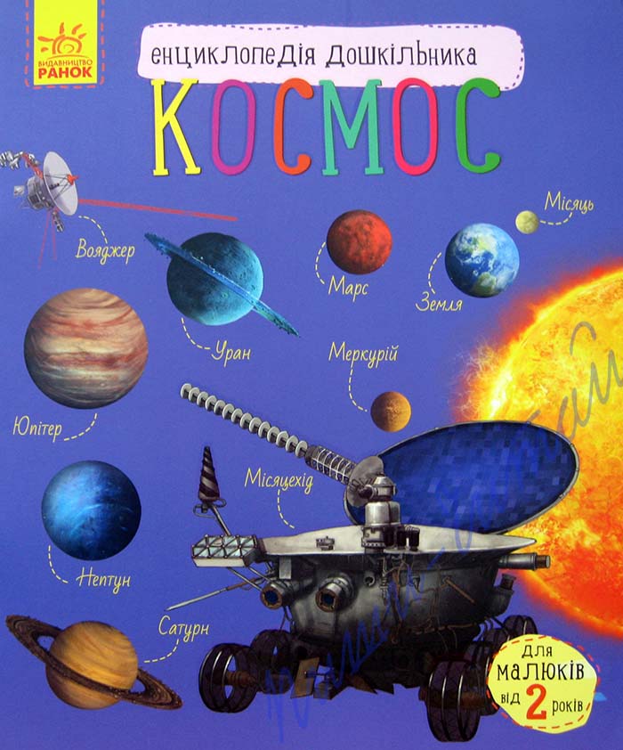 Если Вашему ребенку уже исполнилось 2года, Вы можете познакомить его с такими книгами, как энциклопедии. Вас ждут короткие тексты, большие яркие иллюстрации, понятные малышу, смешные стишки. Рассматривайте вместе с ребенком картинки, читайте интересные тексты о том, что где мы живем, какое место занимает планета Земля в космосе, что такое звезды, созвездия и галактики, как происходит солнечное затмение и почему Луна – это спутник Земли, чем примечательна каждая планета Солнечной системы, что такое астероиды, кометы и метеориты, и как ученые изучают космос. Уверены, что эта книжечка понравится Вашему малышу, она станет интересным началом путешествия в мир знаний. Обложка книги - тонкий картон (мягкая), язык - украинский, на русском языке - под заказ.