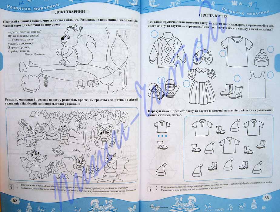 Перед Вами рабочая тетрадь для комплексной подготовки ребёнка к школе. В тетради пять разделов, содержащих учебный материал и задания по основным темам дошкольной подготовки. Раздел 1 "Підготовка до письма" содержит задания, направленные на развитие мелкой моторики рук, глазомера, точности движений и пространственного воображения. Задания следуют по принципу «от простого к сложному» : раскрашивание и дорисовывание, рисование по пунктиру и точкам, написание основных типов линий на листе в клеточку и чистом листе, графические диктанты, штриховка. Материал Раздела 2 "Розвиток мовлення" направлен на увеличение словарного запаса и развития связной речи. Темы этого раздела: моя семья, игрушки, овощи и фрукты, деревья, домашние и дикие животные, птицы, одежда и обувь, транспорт, профессии, мебель, посуда, еда, цветы, экзотические животные. В Разделе 3 "Математика" собраны задания, которые помогут систематизировать и закрепить знания элементарных математических понятий: большой-маленький, высокий-низкий, длинный-короткий, широкий-узкий, толстый-тонкий, сравнение множеств (больше, меньше, одинаково), расположение предметов в пространстве и относительно других обьектов, геометрические фигуры, написание цифр от 0 до 9, счёт до 10. Задания Раздела 4 "Логіка" помогут в развитии логического мышления, умения анализировать, сравнивать, обобщать и классифицировать: найти лишний предмет в группе, разделить совокупность разных предметов на группы, найти отличия на рисунках, найти правильную последовательность (событий, от меньшего к большему, и т.п.). Одним из самых интересных для ребёнка будет Раздел 5 "У світі природи" - множество фактов и сведений наверняка привлекут внимание малыша. Небольшие, но довольно подробные иллюстрации помогут взрослым провести беседы на различные темы: солнце, воздух, земля, вода, времена года и растения, животные. Тетрадь рекомендована как для индивидуальной работы, так и для занятий в дошкольных учреждениях. Тетрадь на украинском языке.