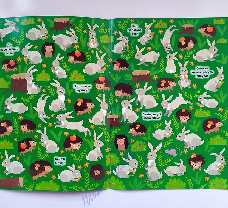 Видання серії «Знайди та покажи» - це не тільки яскраво ілюстрована книжка, а й неймовірна, захоплива гра! Обережно, книга має магічну силу: кожен, дорослий чи дитина, хто відкриє її першу сторінку, зануриться у світ героїв книги повністю і буде знаходитися там, доки не розгадає всі їхні загадки і таємниці! Грайте разом з дітьми в шукача, звертайте увагу на непомітні на перший погляд дрібниці, на емоції героїв, їхні дії, спільне і відмінне, рахуйте, порівнюйте. І так, граючи, поступово, Ви допоможете дитині розширити її словниковий запас, потренуєте пам’ять та увагу, навчите міркувати, творчо підходити до вирішення різних завдань. Кожен розворот видання містить велику барвисту ілюстрацію з безліччю різноманітних кумедних персонажів і запитання, що підкажуть, які несподіванки потрібно шукати на картинці. В книжці «Таємничий ліс» із своїми загадками на вас чекають їжаки і зайці, олені, лосі і рисі, різноманітні пташки, ведмеді, павучки, комашки, равлики і гусені, єноти і вовки, білки й сови. Також приємним бонусом стане набір кольорових наліпок, який маленький розумник зможе використати за власним бажанням. Подаруйте дитині незабутні хвилини захопливої гри! Порада від Пиши-Читай: купуйте одразу декілька книжок серії, тому що дитині неодмінно захочеться продовження!